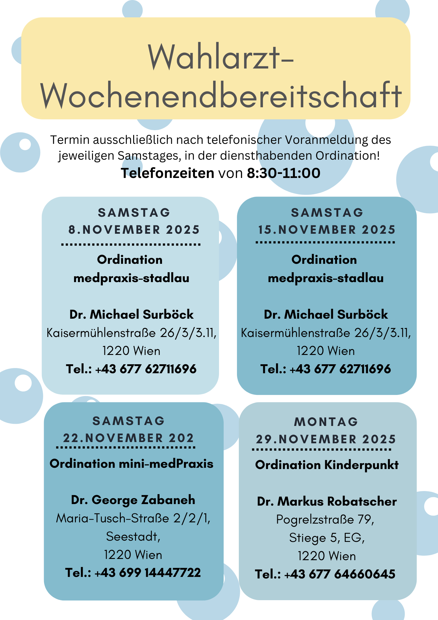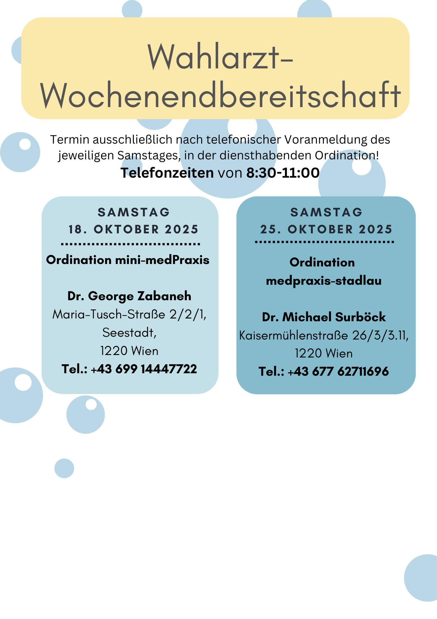 • Mit Oktober 2025 wieder: Wahlarzt-Wochenendbereitschaft von 3 Ordinationen im Wechsel.