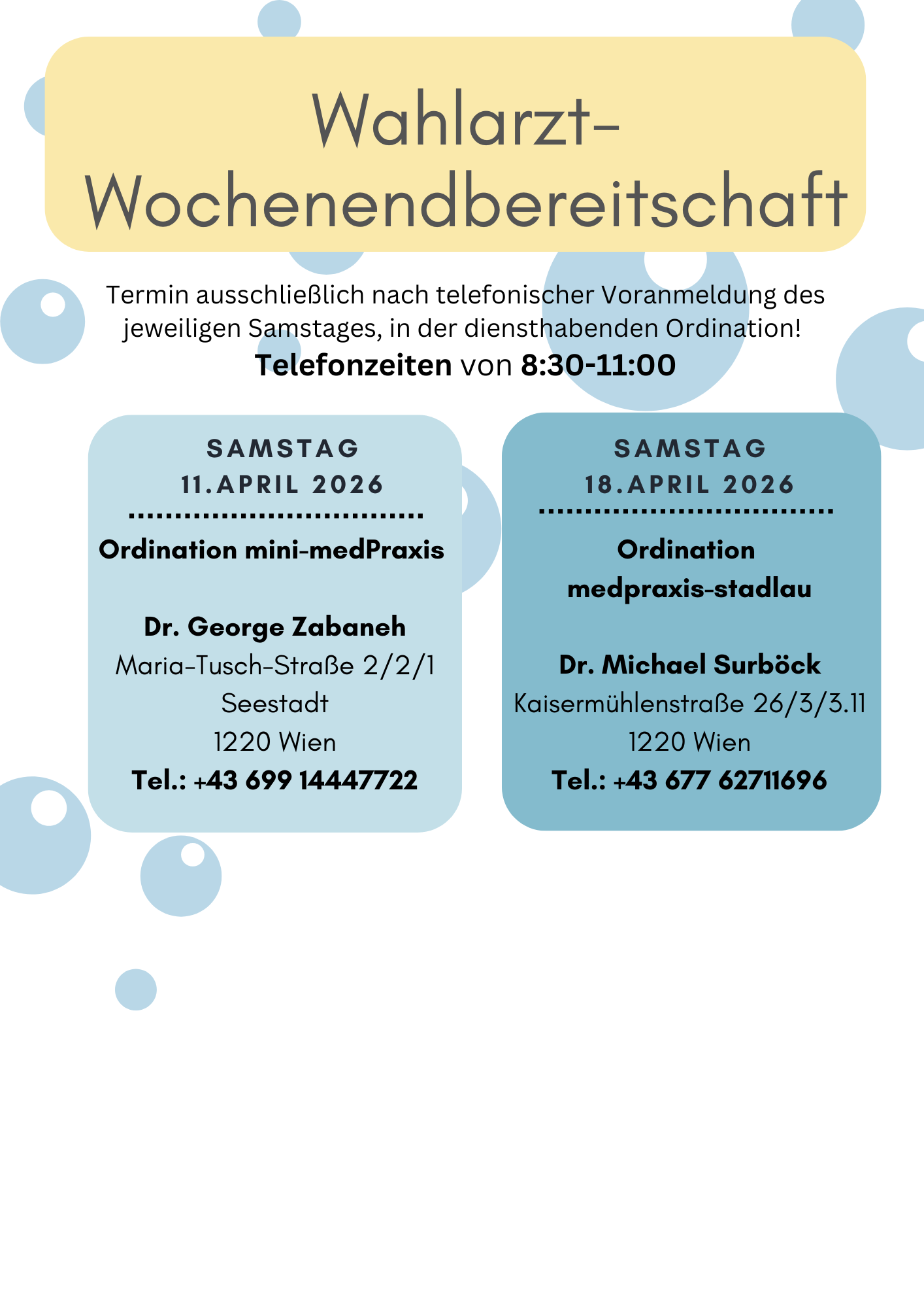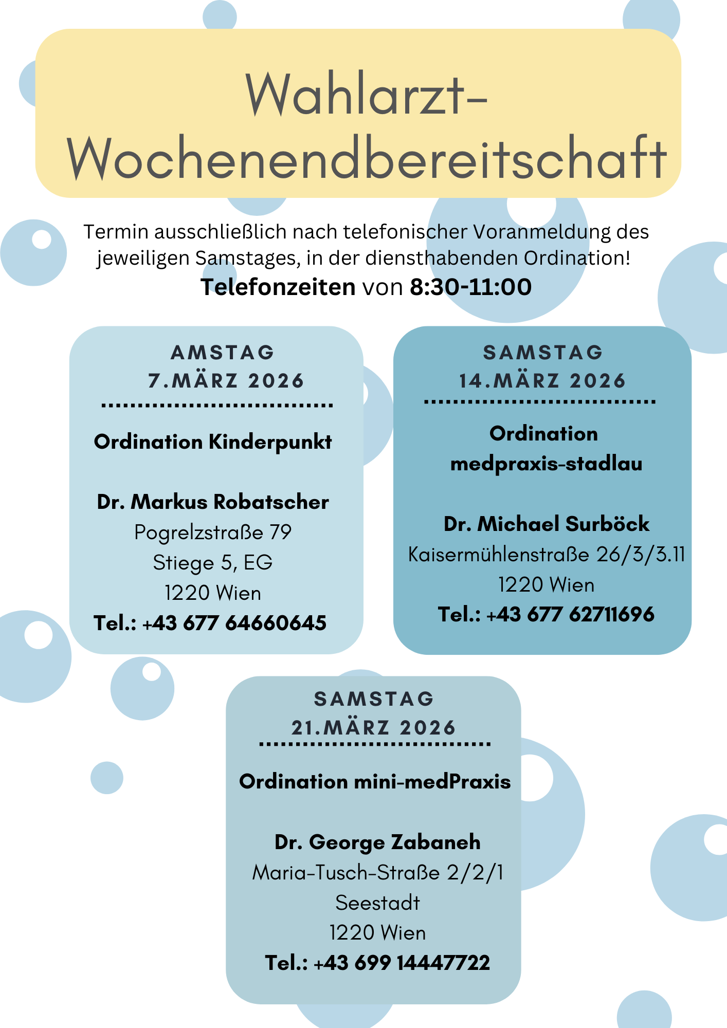 Die Ordinationen mini-medPraxis, medpraxis-stadlau und Kinderpunkt bieten Ihnen seit Oktober 2023 eine Wahlarzt-Wochenendbereitschaft an. Eine telefonische Voranmeldung ist unbedingt notwendig!